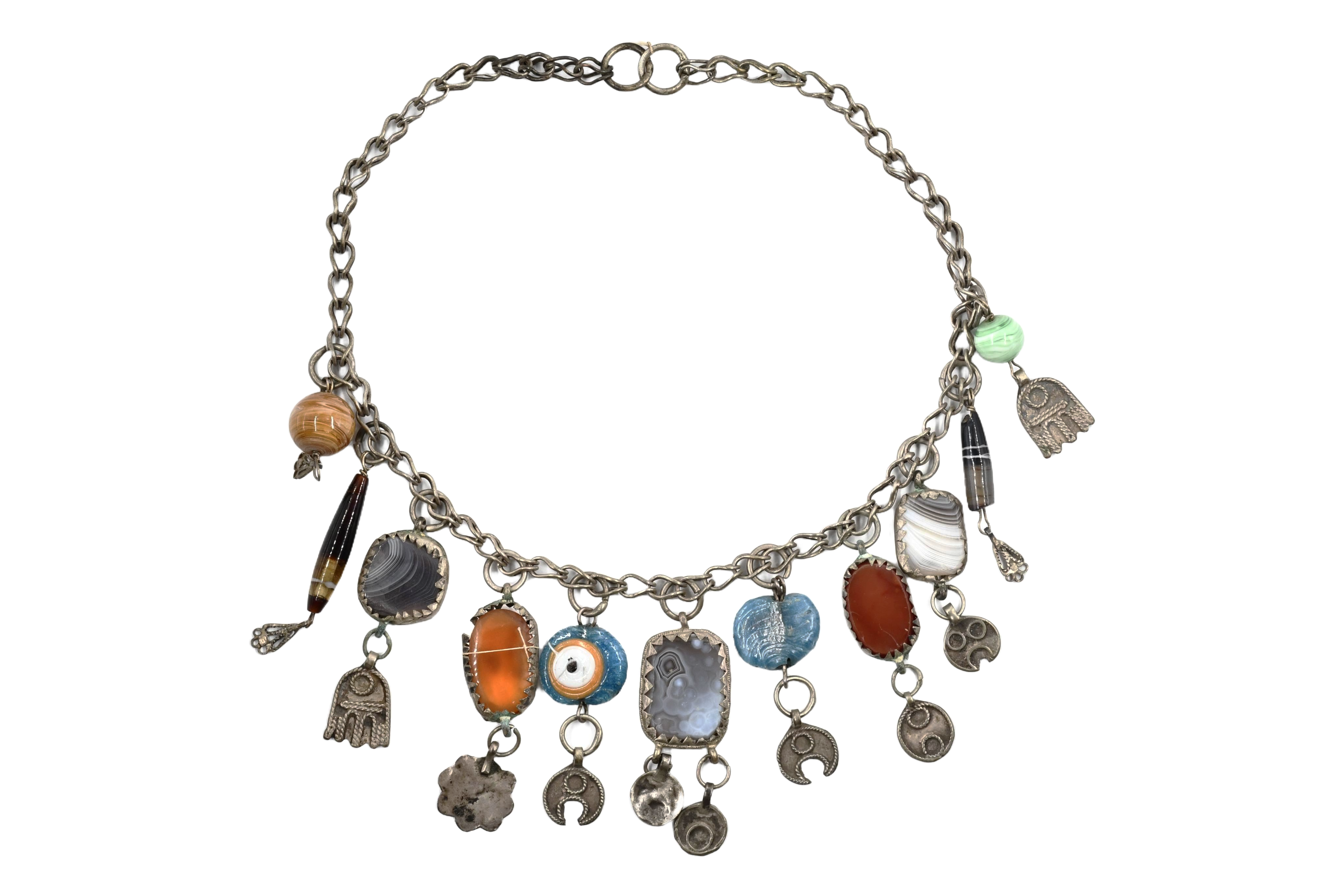 سلسلة [chain] (also sewn on the hat by some fellahin [peasant women], it contains: eyes, hands, crescents and stones. The middle stone shows [the] eye as if it were natural, and is therefore said to be very effective (against the evil eye), Jerus [Jerusalem], 1913.