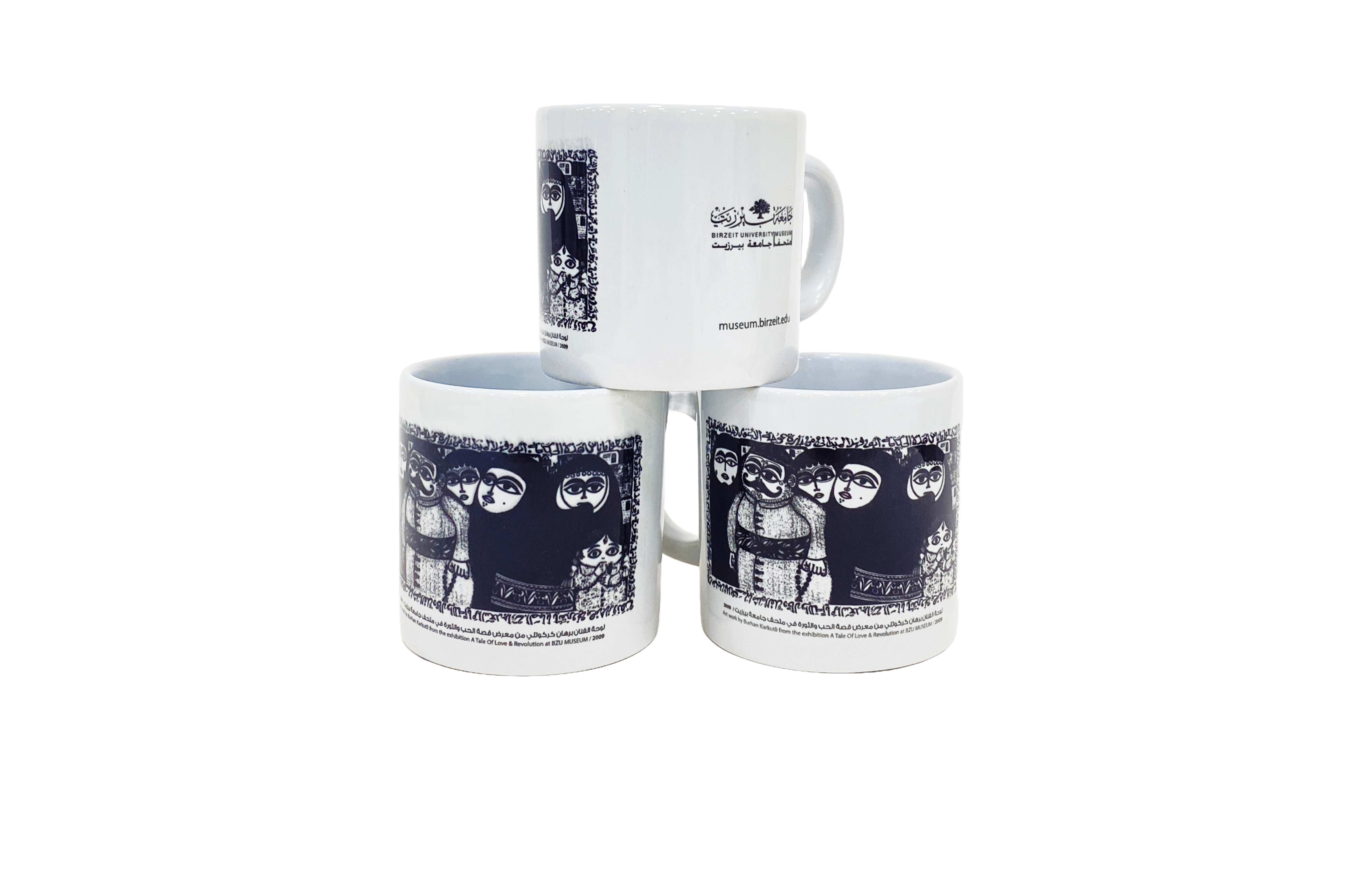 كوب سيراميك، قصير المدى، باللون الأبيض مع طباعة باللون الأسود. يحمل هذا الكوب عملاً فنياً بعنوان "أبو فهد وزوجاته" للفنان برهان كركوتلي، من معرض "قصة الحب والثورة" في متحف جامعة بيرزيت، 2009