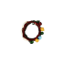 Malak Dress made with Ikhdari cloth with green, burgundy, orange and black stripes. The sleeves are made with silk hirmizi cloth. Embroidery on the chest panel resembles the traditional stitch of malak dress with floral motifs, while the neck and shoulders slot is made with pink cloth, connected to the chest panel by a line of velveteen russet. The front side of the dress shows the original cloth colors without embroidery, while the back side shows 4 horizontal stripes of the cloth. The banayeq (sidelines) are of silk cloth, and are connected to the dress by manajel (thick braidwork connecting the dress parts) with simple floral motif embroidery in the bottom.