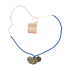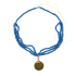 A dress with intense embroidery work on the chest panel similar to qalayed (necklaces) motif, surrounded with different designs of braidworks including flowers. The neck and shoulders are embroidered from the sides with different motifs, centered with an orange hirmizi needle work with flower shapes. The sleeves show different designs of embroidery, while the banayeq (sidelines) and the front and back sides show intense embroidery work in blue with cypress tree and feather motifs, along with talismans on the top side of the sidelines.