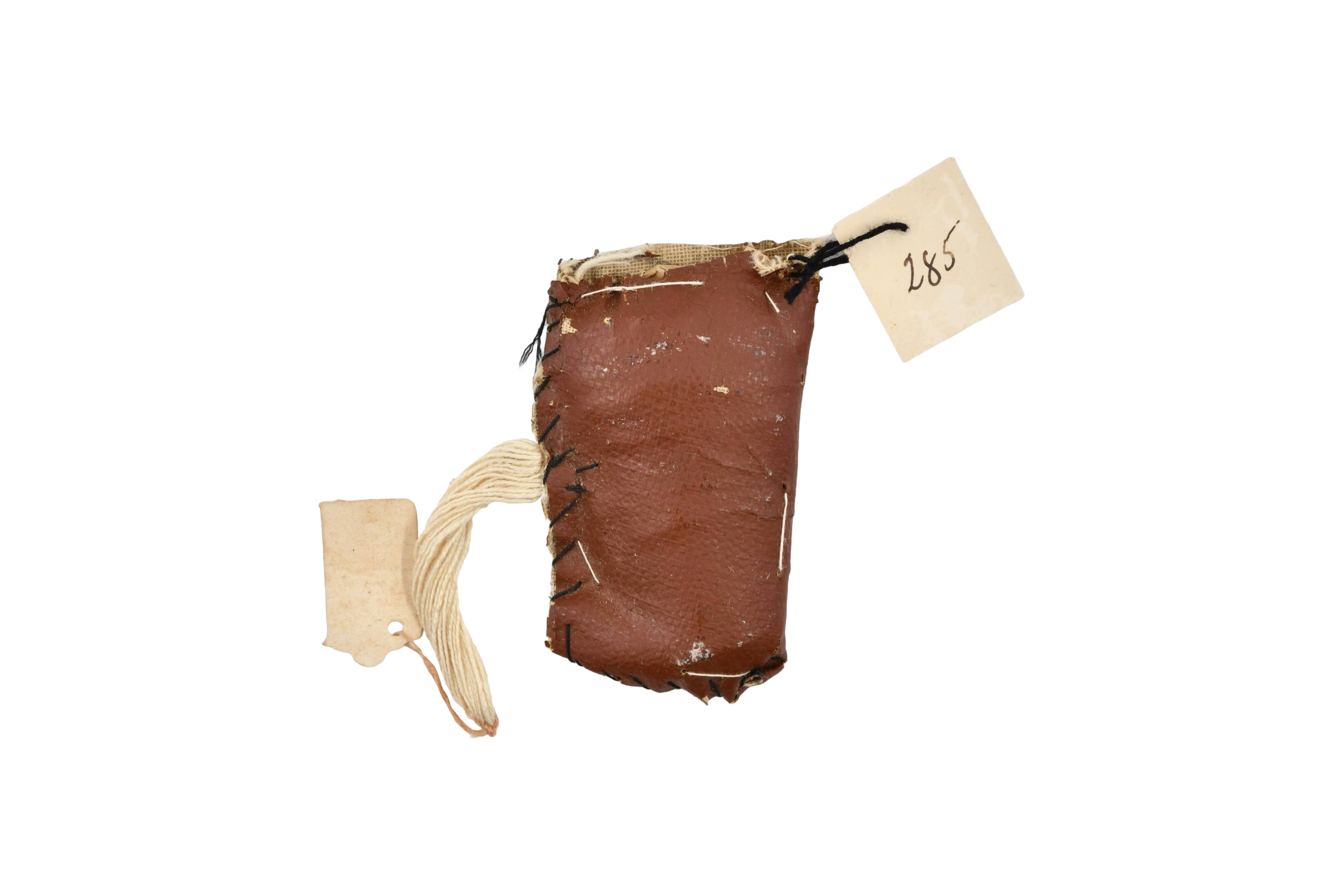 طلسم بقماش أزرق؛ ضد عين الحسود؛ بذور فلفل، قزحة (أيضاً حبة بركة) وقليل من التراب، بيت أونيا، عام 1916. الكيس الخارجي جديد، بذور الفلفل والقزحة هي ضد عين الحسود؛ لا أعرف من أين جاء التراب.
