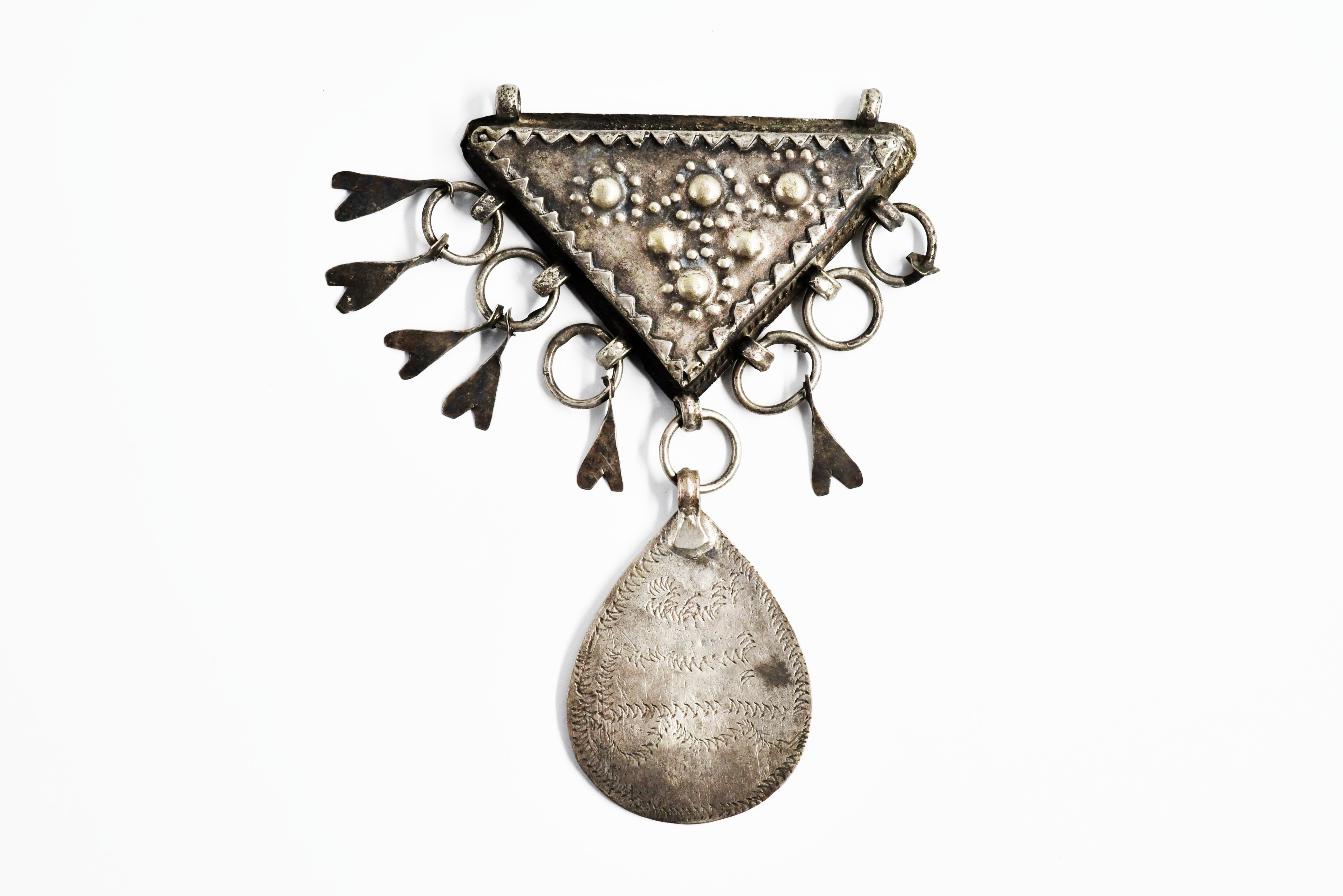 A triangular replica  of a talisman case. Contents? It has seven appendages; the middle (one) is an oval Mâskeh, which are probably primitive imitations [replication] of the tree of life. 1916 Jerusalem.
